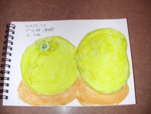 1) スケッチブックから〜国産柑橘類(下)(1) パール柑(熊本産) 文旦の一種で2個で1キロ。B6版スケッチブックに納めるための苦肉の構図。甘味と酸味がマッチして喉の渇きを潤してくれる。皮をピーラーで薄く向いて砂糖漬けに。残りはお風呂に浮か…