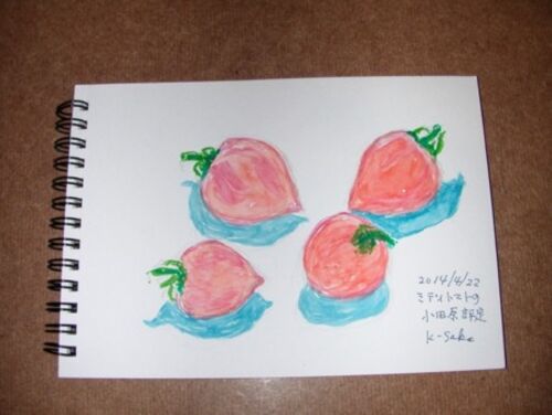 (1)馬子にも衣装先のとんがったミディトマトを幼稚園児が口を尖らせてお喋りする場面に見立てて描いて「ミディトマトの小田原評定」と名付けていたのだが、思い立って昔ロンドンのフリーマーケットで買ったミニ絵画の額縁から中の作品を取り除いてこれを…